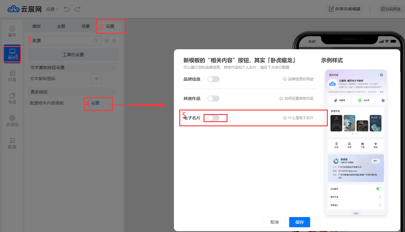點擊【設計】,點擊【設置】,在搜索欄輸入”配置”關鍵字查找,點擊【配置相關內(nèi)容面板】設置,開啟電子名片功能