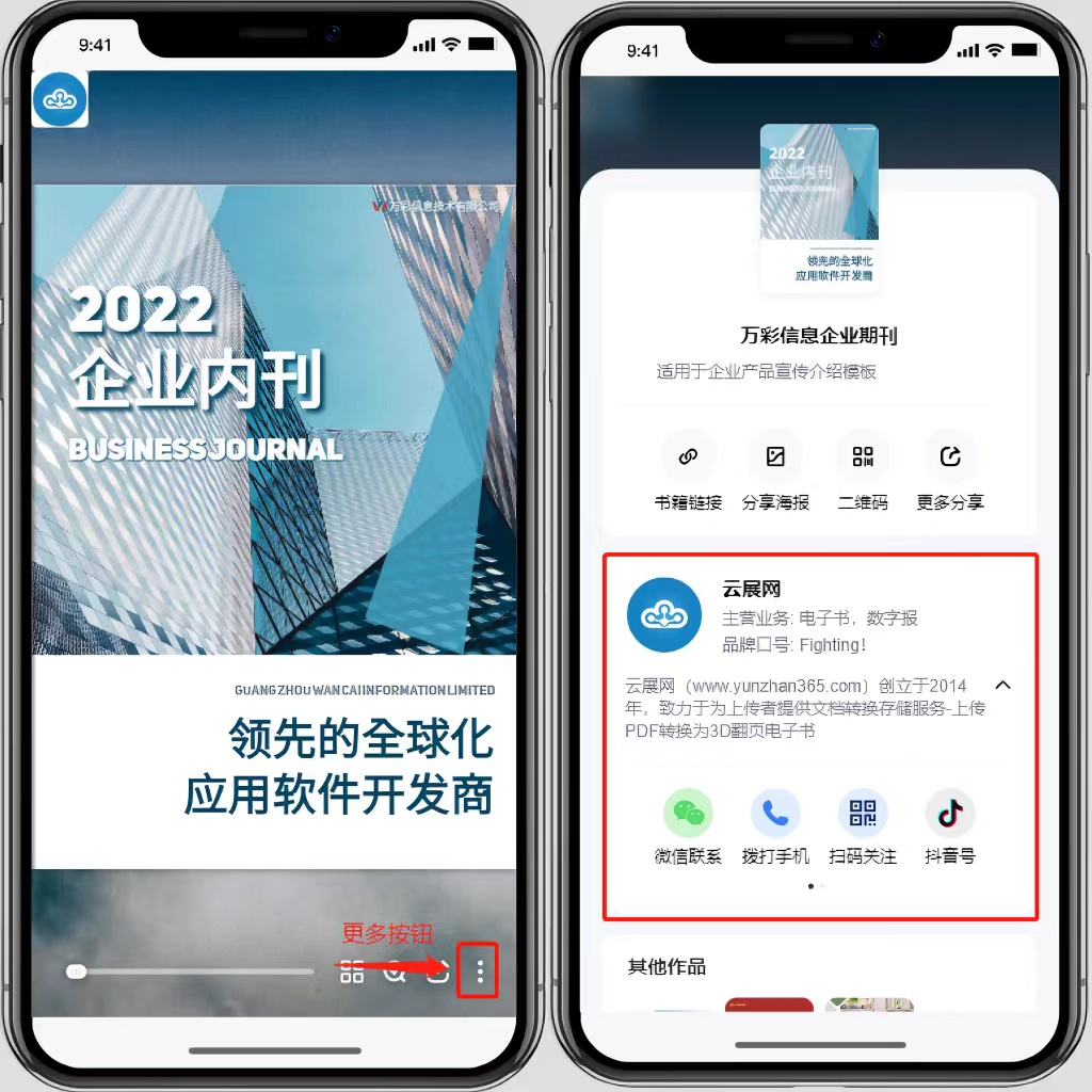 點擊電子畫冊的【更多按鈕】彈出品牌信息以及聯系方式