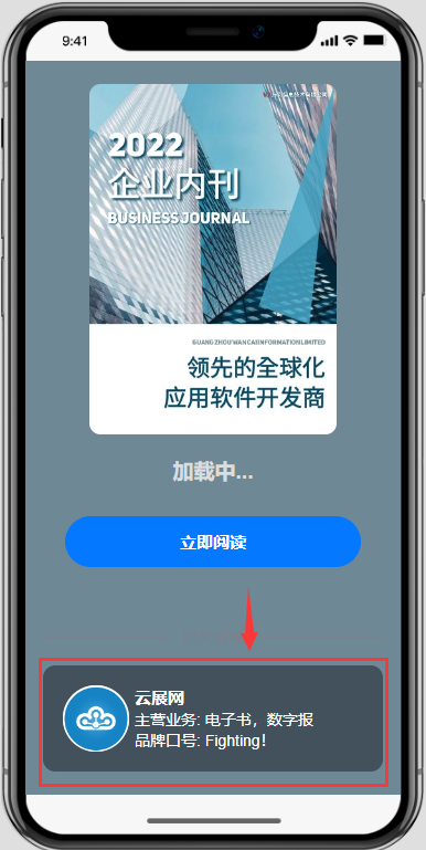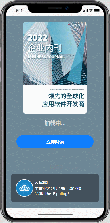 在電子畫冊的加載頁正下方顯示Logo、品牌名稱、主營業務、品牌口號這四個信息,讀者點擊后,可彈出聯系方式
