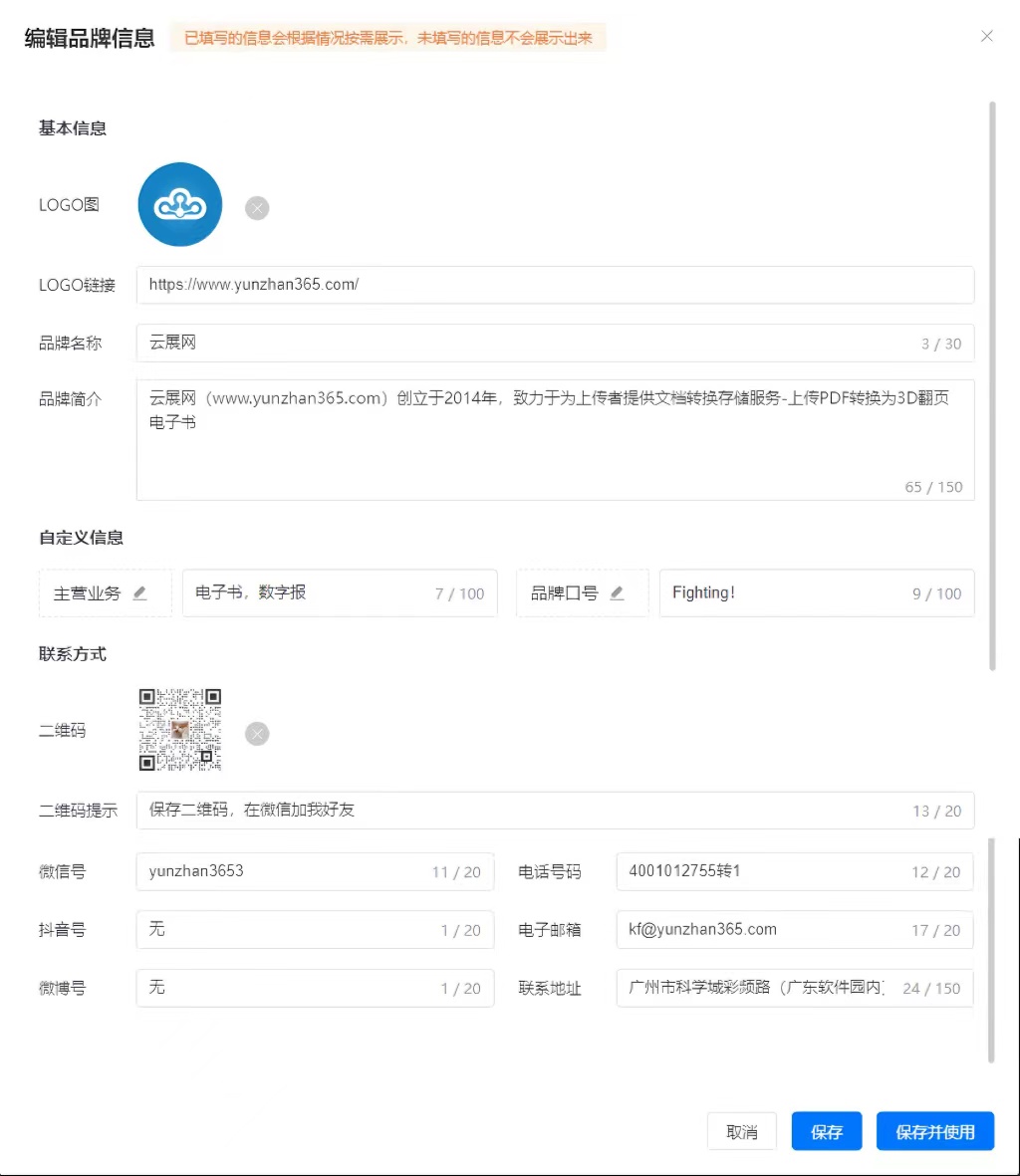 1)品牌信息功能是在原Logo功能的一個升級,在原Logo功能的基礎上,添加了品牌名稱、品牌簡介、自定義信息、聯系方式等信息的配置??梢栽诩虞d界面的引導頁、相關內容面板等地方,展示品牌信息。