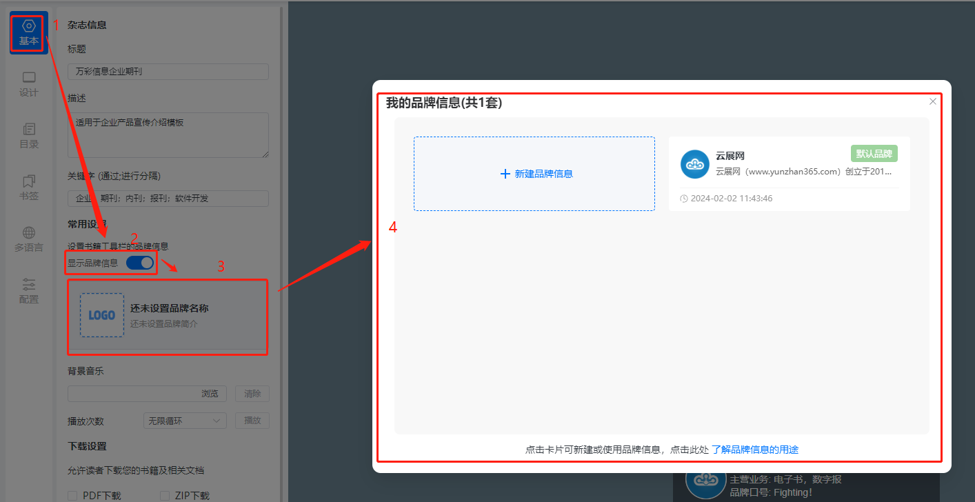 點擊【基本】,打開【顯示品牌信息】,選擇使用一個創建好的品牌信息