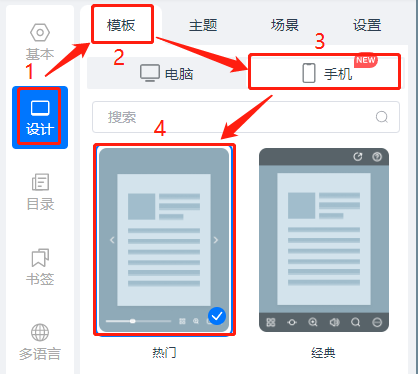 點擊【設計】,再點擊【模板】,最后點擊【手機】,選擇【熱門】模板