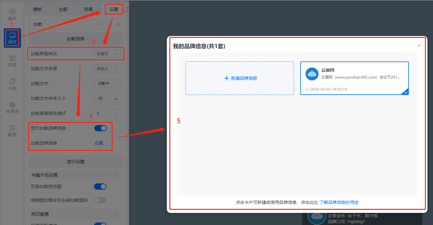 點擊【設計】,再點擊【設置】,將【加載界面樣式】改為【引導頁】,然后打開【顯示加載品牌信息】,最后選擇使用一個創建好的品牌信息