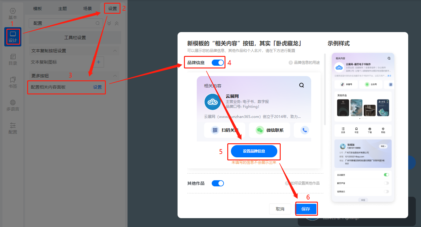 點擊【設計】,點擊【設置】,設置【配置相關內容面板】,打開【品牌信息】,點擊【設置品牌信息】,選擇使用一個創建好的品牌信息,最后點【保存】