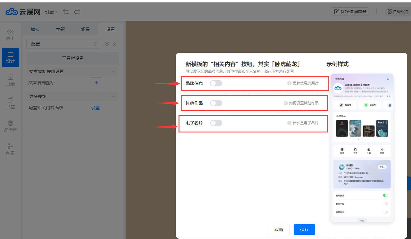 “相關(guān)內(nèi)容”面板功能有三個(gè),【品牌信息】、【其他作品】、【電子名片】。