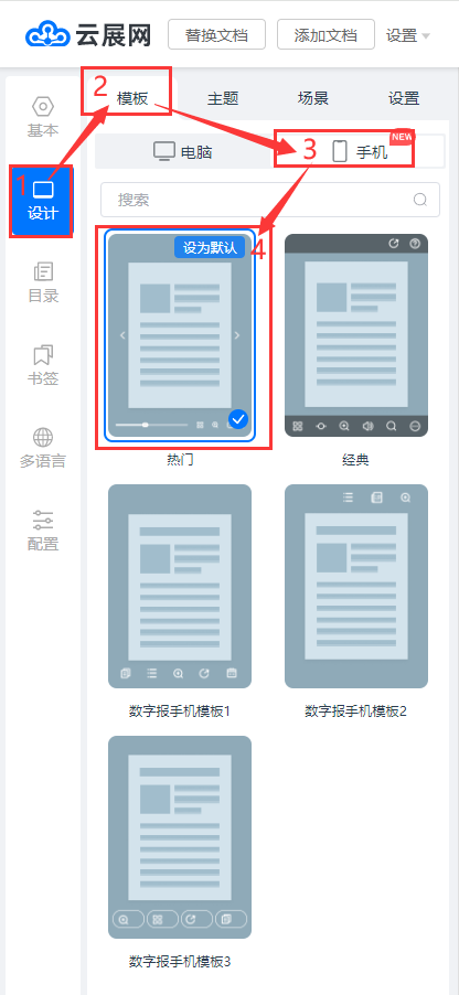 點(diǎn)擊【設(shè)計(jì)】,點(diǎn)擊【模板】,點(diǎn)擊【手機(jī)】,選擇熱門(mén)模板