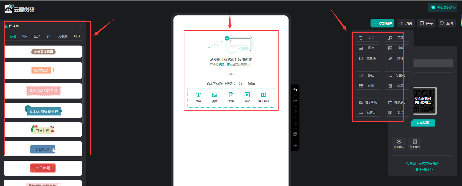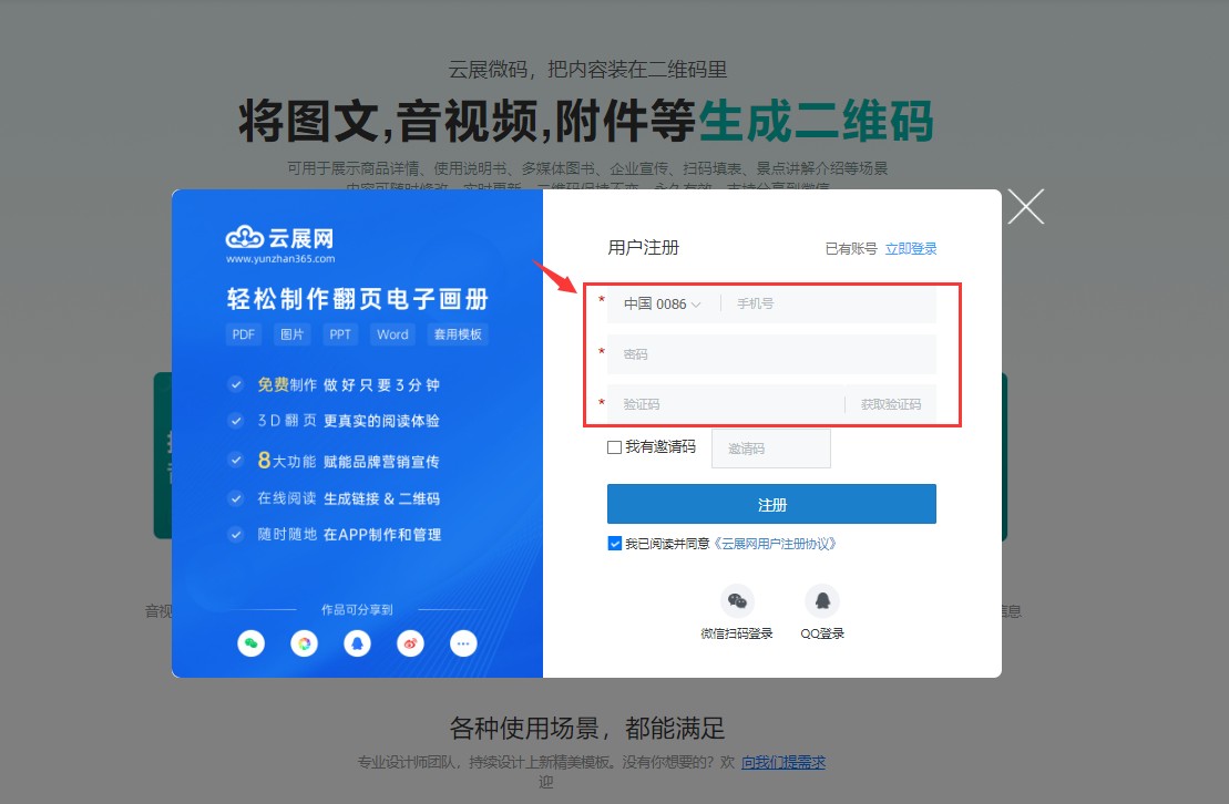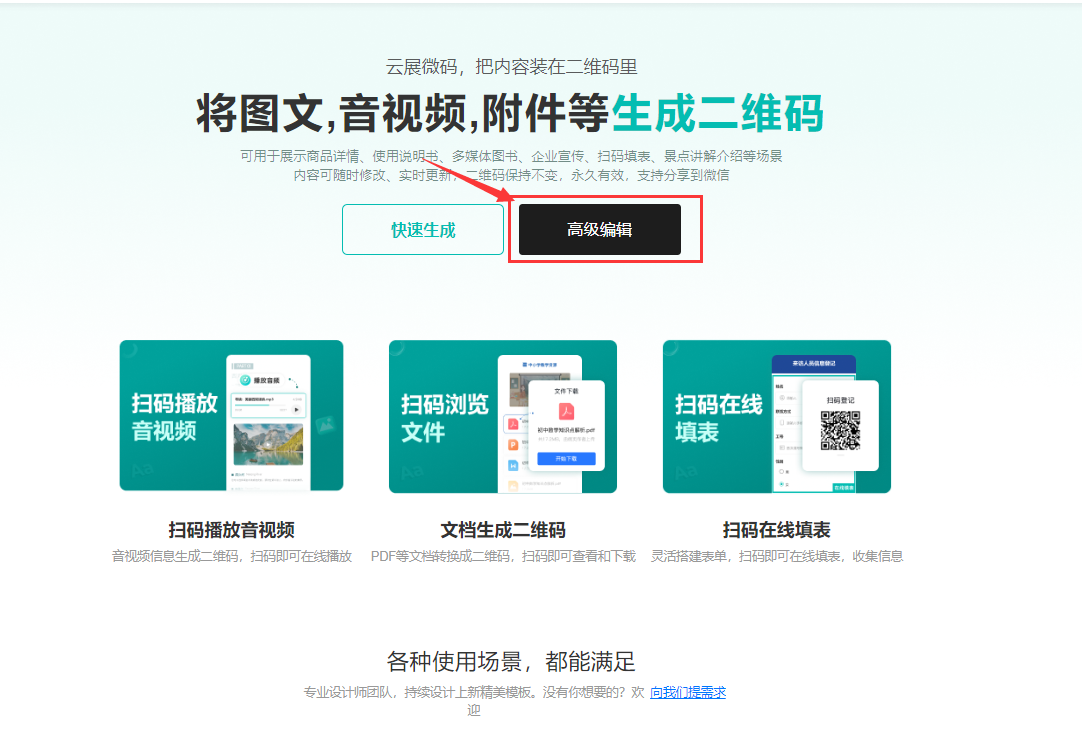 云展微碼是指將圖文、音視頻、附件等內容快速生成H5、海報圖片、長頁圖片、問卷表單、邀請函,并一鍵生成二維碼在線查看。可在產品介紹、企業宣傳、教輔圖書多媒體資料、電子書架、使用說明書等多領域靈活應用。