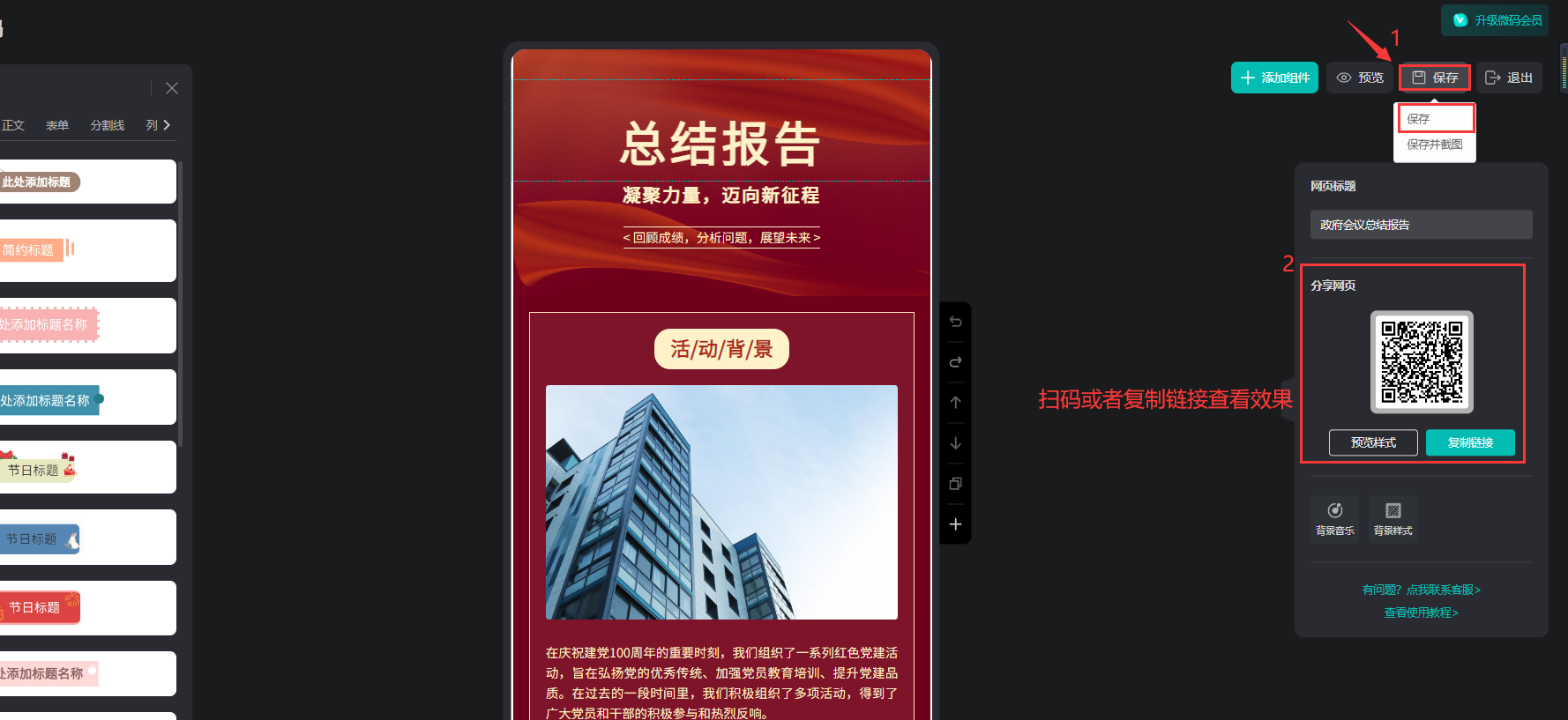 5、編輯排版好后點擊右上角的【保存】,保存后可以生成微碼鏈接和二維碼分享