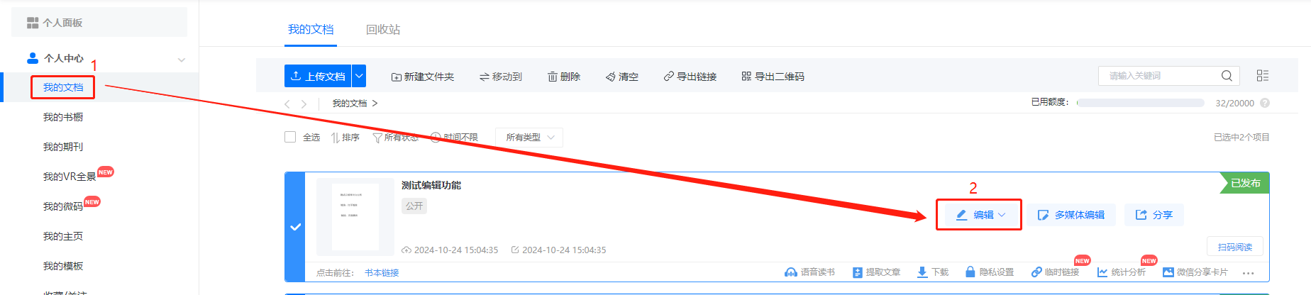 點(diǎn)擊【我的文檔】,選擇需要設(shè)置的電子書(shū),點(diǎn)擊【編輯】。