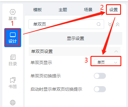 點(diǎn)擊【設(shè)計(jì)】,再點(diǎn)擊【設(shè)置】,單雙頁(yè)顯示選擇【單頁(yè)】。