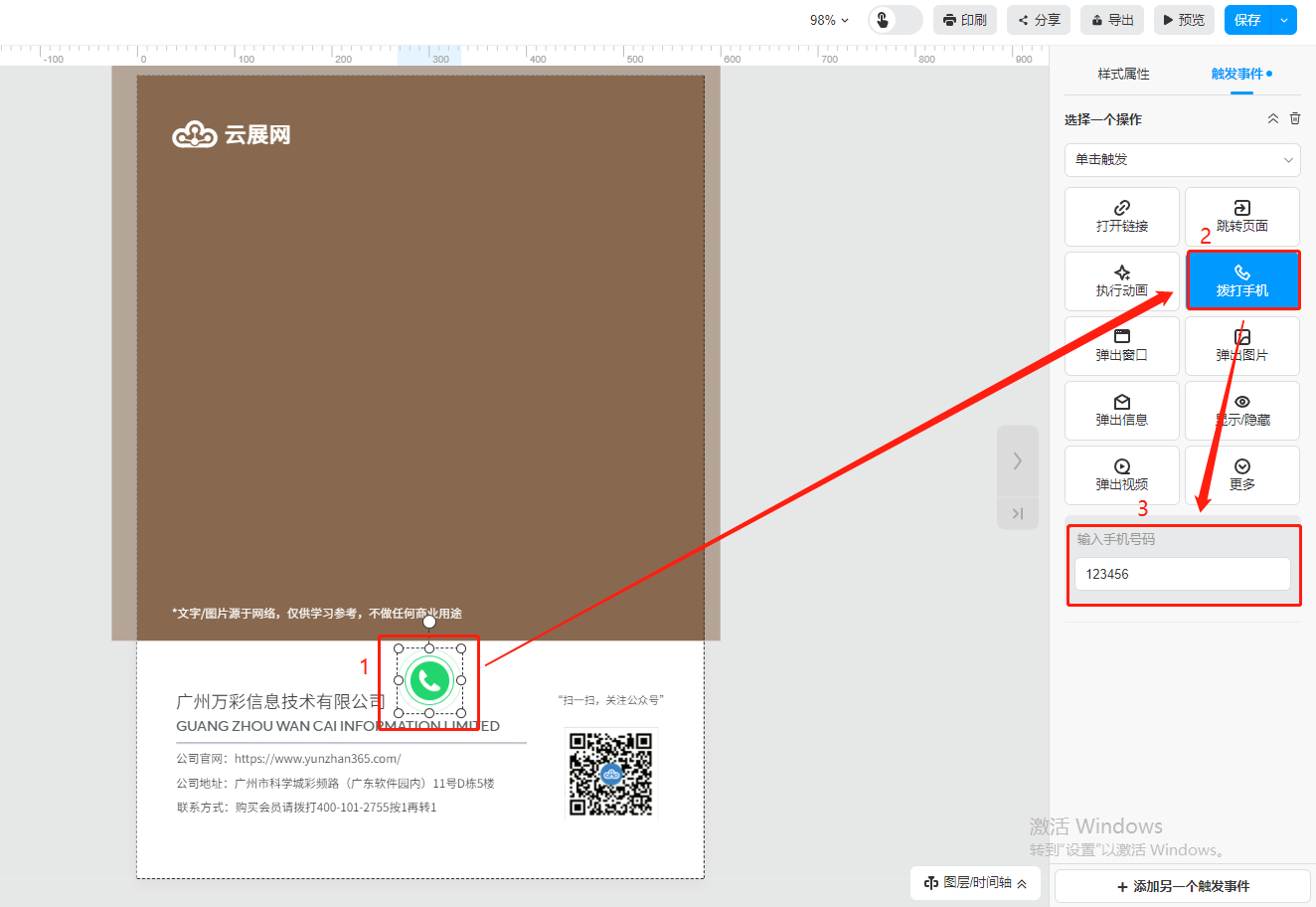 點擊頁面上的電話按鈕,在右邊界面屬性可以輸入希望讀者聯系的電話號碼。