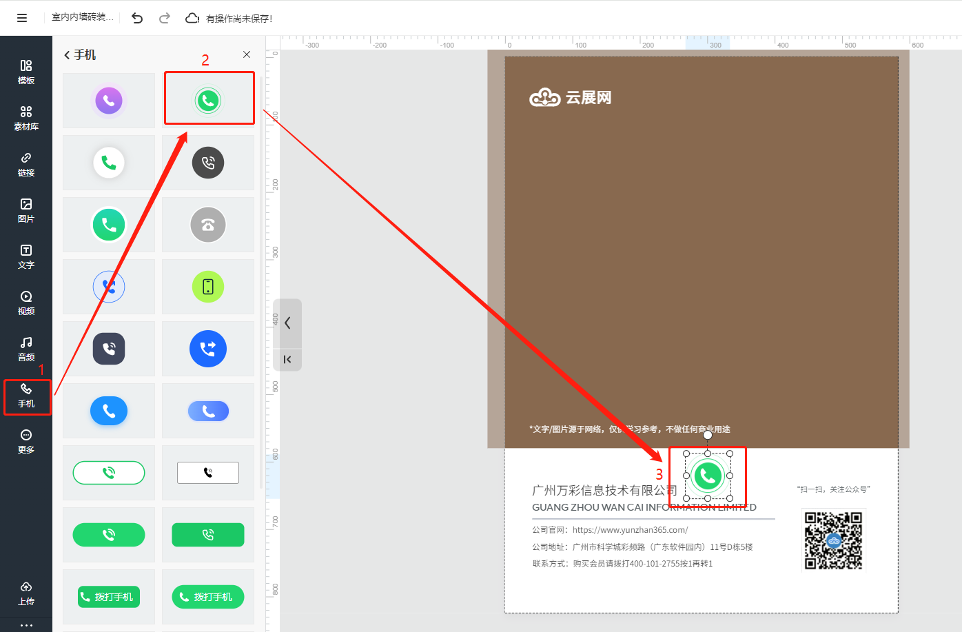 進入多媒體編輯頁面后點擊【手機】,然后選擇按鈕樣式,就會有一個電話按鈕出現在頁面上。