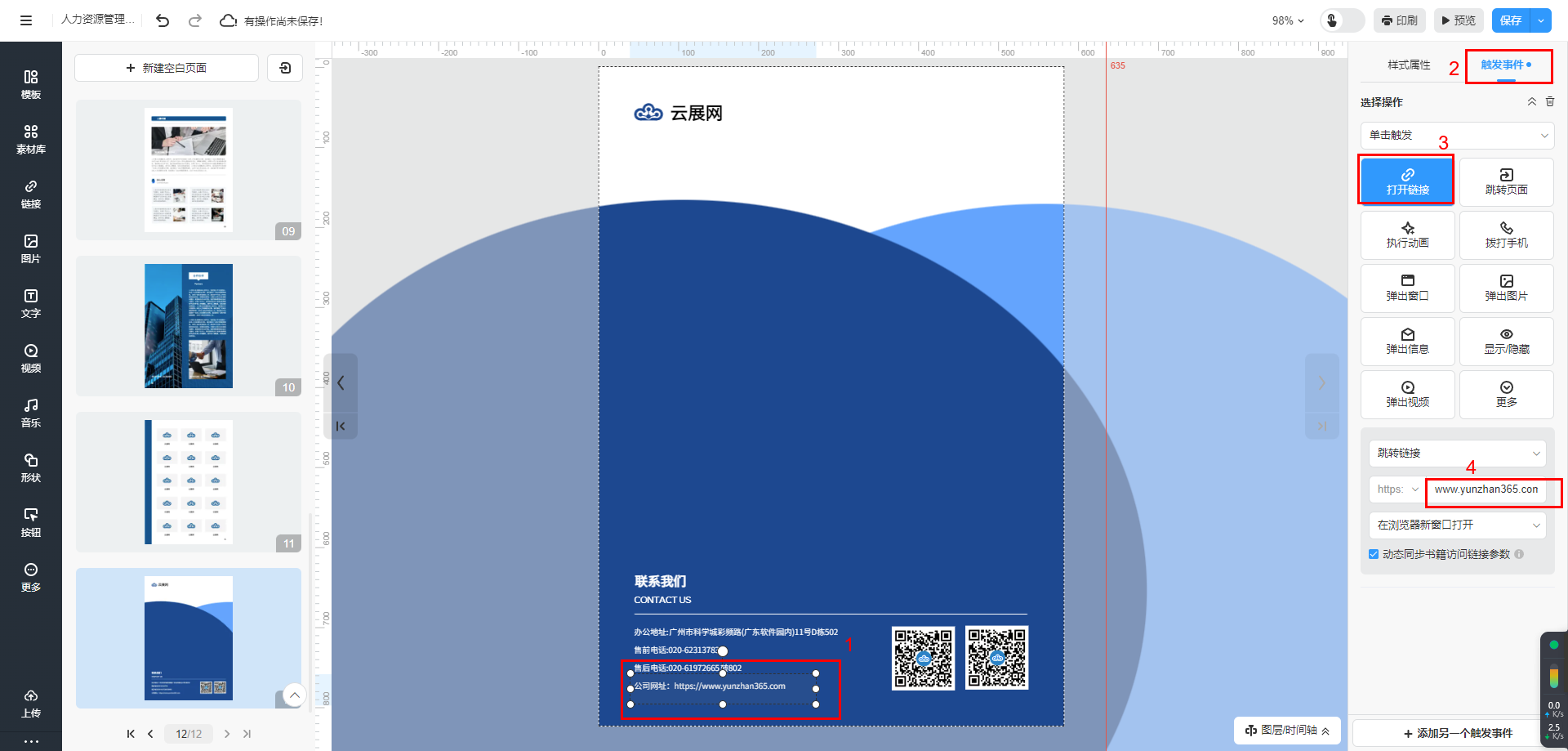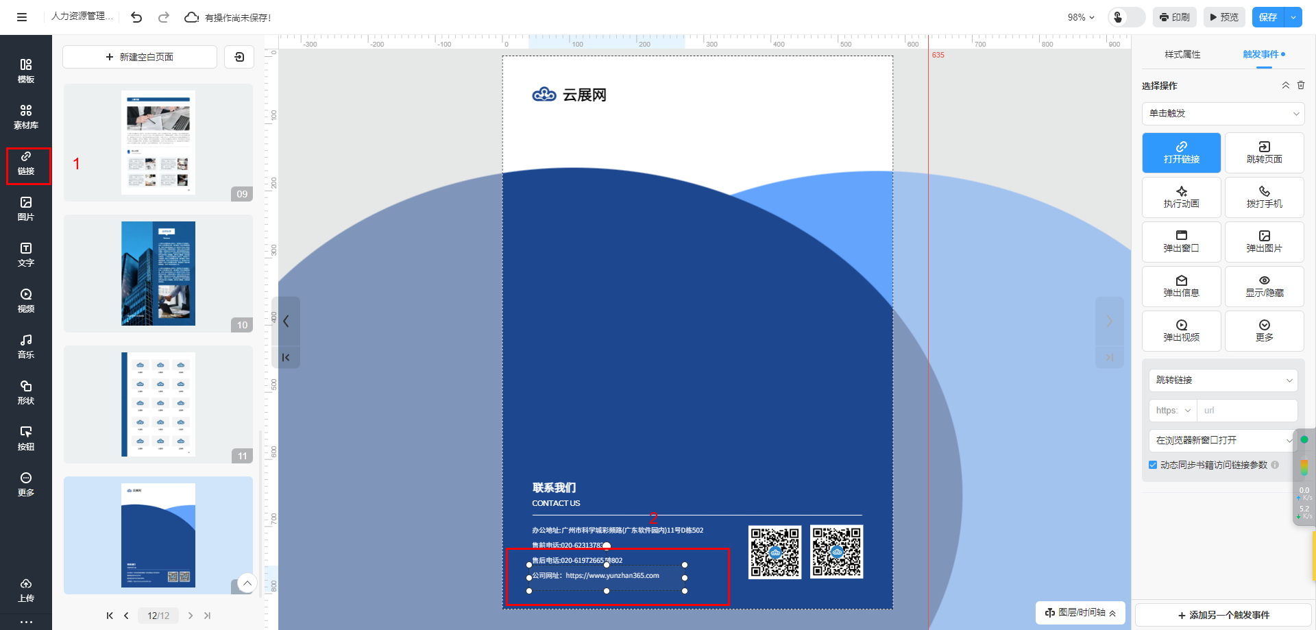 (2)在右邊設(shè)置面板,點(diǎn)擊【觸發(fā)事件】,選擇【打開鏈接】動作并且輸入跳轉(zhuǎn)鏈接。