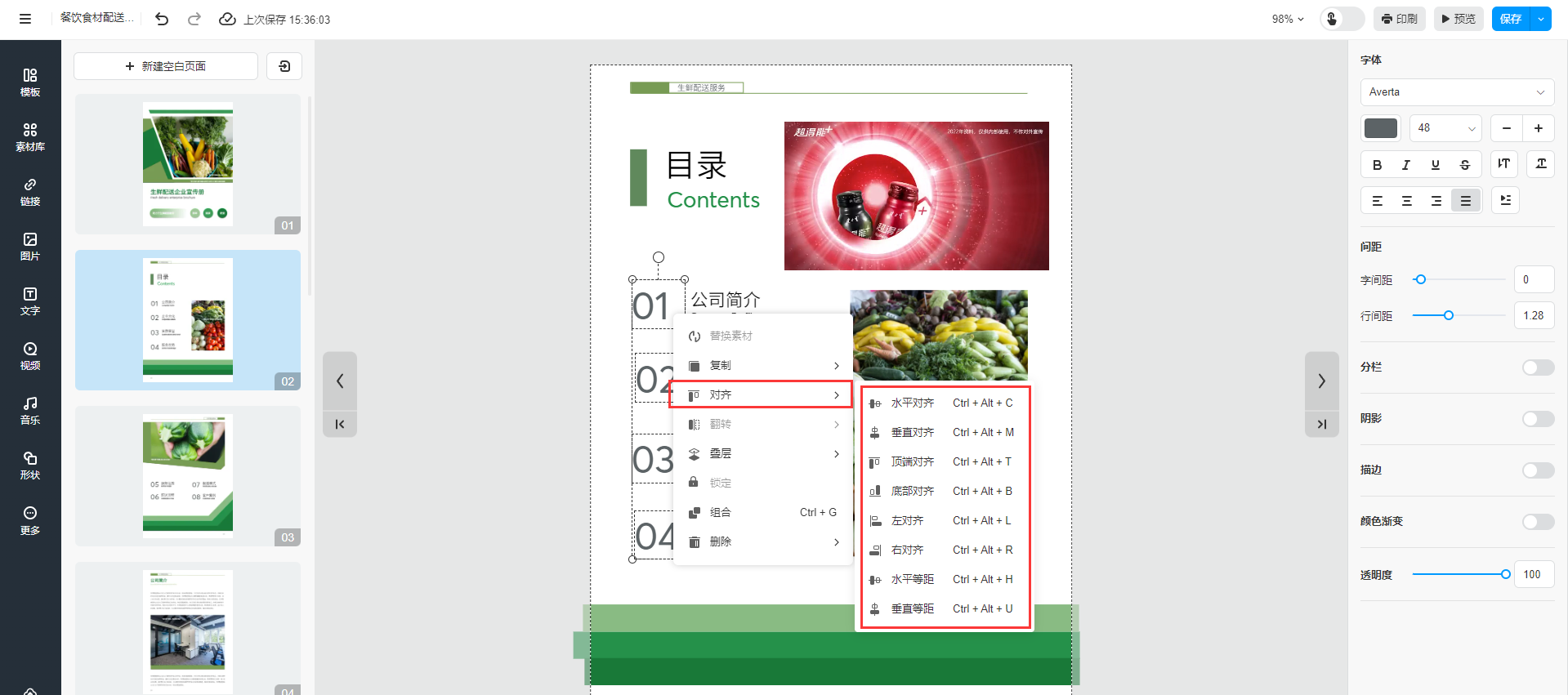 設置文本框對齊方式 一、功能介紹 當頁面中有多個素材/文本框需要對齊時,可以通過設置文本框的對齊方式,輕松地將頁面內容整齊排列。 二、操作步驟 1.進入編輯器界面 點進【我的文檔】/【文檔】,選擇對應電子書,點擊【多媒體編輯】/【內容編輯】。 2、設置對齊方式 按住鍵盤“ctrl”,鼠標單擊選擇需要對齊的素材/文本框,然后右鍵點擊,選擇【對齊方式】 3、保存查看效果 點擊右上角的【保存】即可