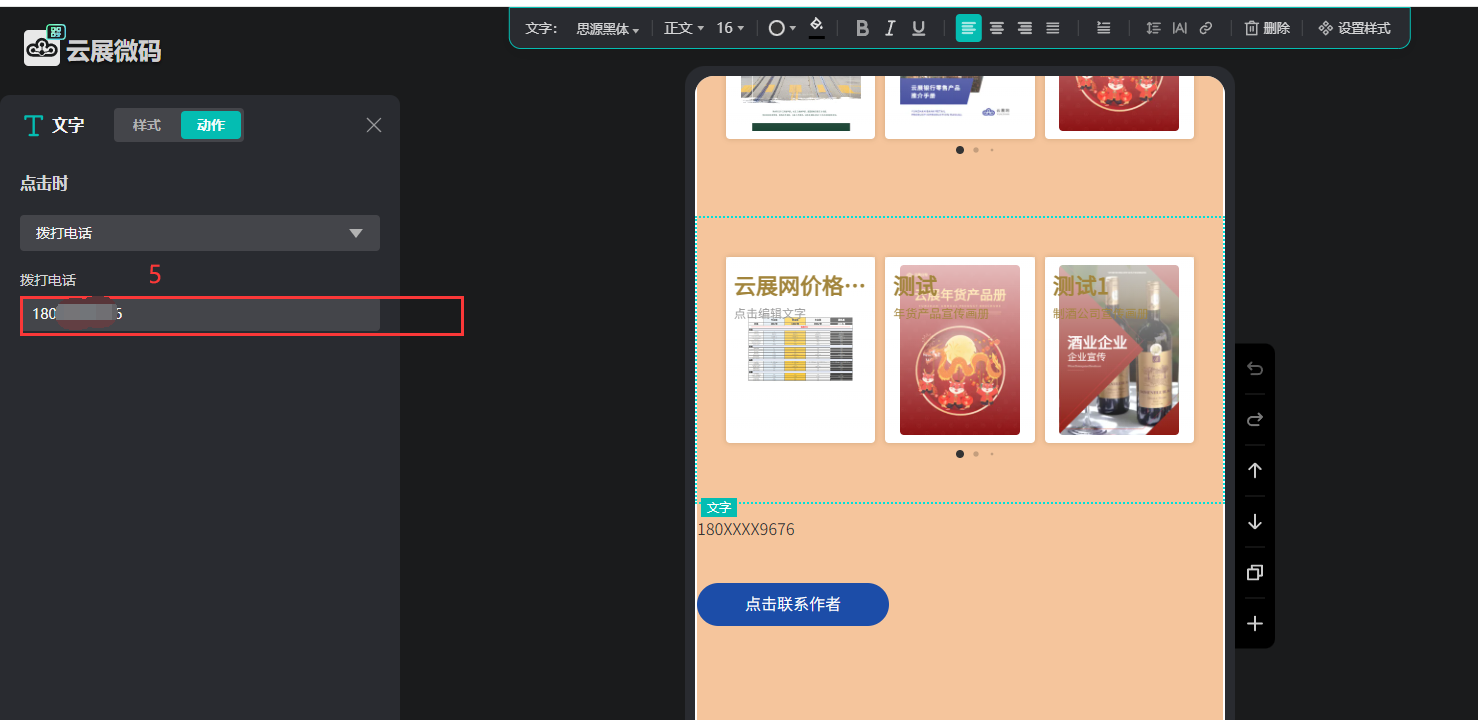 選中聯系電話號碼/按鈕,點擊【設置樣式】,點擊【動作】,設置【撥打電話】,輸入聯系電話號碼